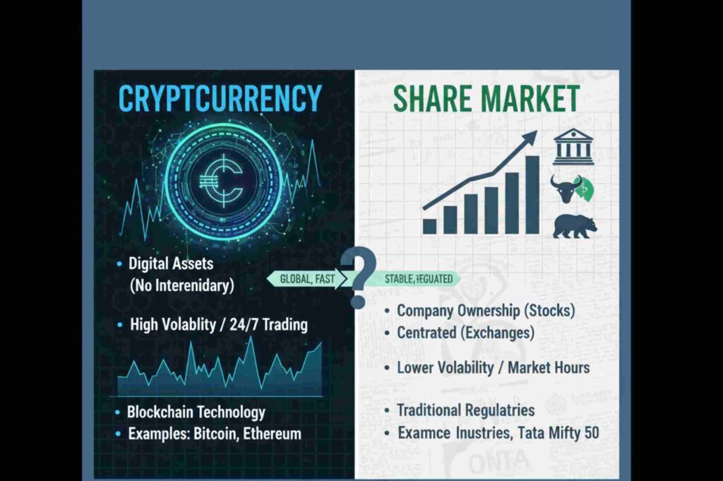 Learn the difference between stock market vs crypto in India. Understand how stocks and cryptocurrencies work, practical examples from Indian context, risks, and benefits — all explained simply for beginners.